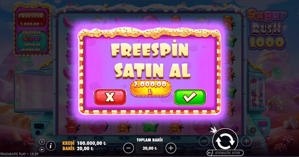 - Покупка супер бесплатных вращений: Это самая главная особенность, которая отличает Sugar Rush 1000 от оригинала. Вы можете купить раунд ’Супер бесплатные вращения“, заплатив ровно 500 раз больше вашей ставки. В этом раунде все места с множителями на сетке с самого начала игры начинают умножаться на 2x. Это дает вам невероятное преимущество для достижения огромных выигрышей.