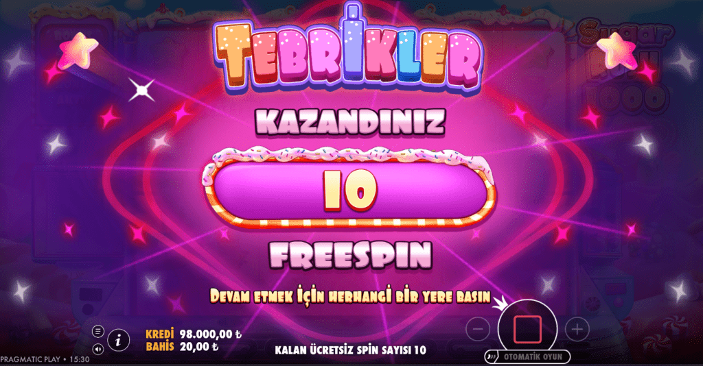 Gelelim herkesin en çok sevdiği kısma: Free Spins (Bedava Dönüşler)! Sugar Rush 1000’de gerçek paranın döndüğü yer burası. Free Spins turunu tetiklemek için temel oyunda (base game) ekranda en az 3 tane Scatter sembolü (roket şeklindeki şeker makinesi) bulmanız gerekiyor.
